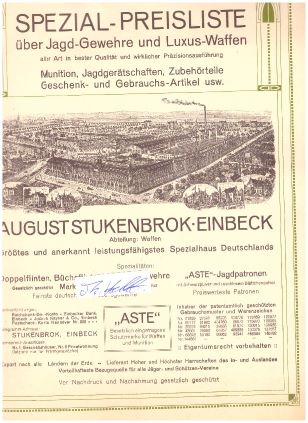 ORIGINAL-WAFFENKATALOG "Spezial-Preisliste über Jagd-Gewehre und Luxus-Waffen aller Art in bester Qualität und wirklicher Präzisionsausführung : Munition, Jagdgerätschaften, Zubehörteile, Geschenk- und Gebrauchsartikel usw. , von August Stukenbrok, Einbek, Abteilung Waffen. Größtes und anerkannt leistungsfähigstes Spezialhaus Deutschlands.
