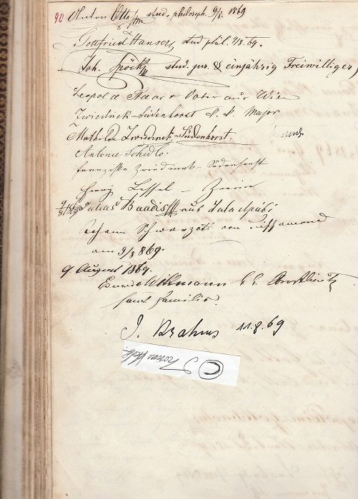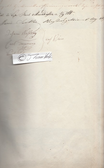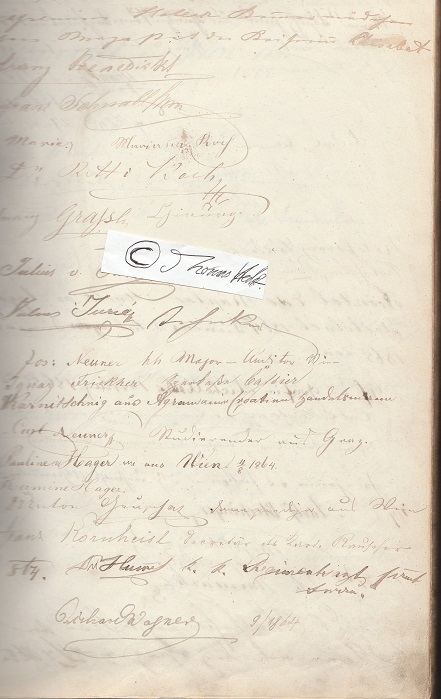 österreichischer Maler); FERDINAND GEORG WALDMÜLLER (1793-1865, bedeutendster österreichischerMaler in der Biedermeierzeit) 3.8.(18)57; MORITZ VON SCHWIND (1804-71, österreichischer Maler und Zeichner der Spätromantik) 1863; JOHANN NESTROY (1801-62,österreichischer Dramatiker, Schauspieler und Opernsänger (Bass). Sein Werk ist der literarische Höhepunkt des Alt-Wiener Volkstheaters) zusammen mit CARL TREUMANN (1823-77, österreichischer Schauspieler, Operettensänger (Tenor), Theaterleiter und Schriftsteller und WENZEL SCHOLZ (1787-1857, österreichischer Schauspieler in Laibach, Klagenfurt, Graz und in Wien vor allem des Alt-Wiener Volkstheaters, der insbesondere als kongenialer Partner von Johann Nestroy in dessen Possen und Lustspielen bekannt wurde) - eigenhändig bezeichnet : AUS WIEN 1849; KAISER FRANZ JOSEPH I. (1830-1916) und KAISERIN ELISABETH VON ÖSTERREICH-UNGARN (2 x, 1837-98 ermordet, genannt SISI); Kronprinz RUDOLF VON ÖSTERREICH-UNGARN (1858-89 SM); ERZHERZOGIN GISELA VON ÖSTERREICH (1856-1932, Tochter von Kaiser Franz Joseph I. und Kaiserin Elisabeth) alle 9.8.(18)70 auf einer Seite mit umlaufenden Stahlstich; ERZHERZOG KARL FERDINAND VON ÖSTERREICH (1818-74, General); FERDINAND IV. SALVATOR DER TOSCANA (1835-1908, Erzherzog von Österreich und ab 1859 der letzte Großherzog der Toskana aus der habsburgischen Sekundogenitur der Linie Habsburg-Lothringen-Toskana); CARL MAAGER (1813-87, liberaler Vorkämpfer der Demokratie in Österreich. Aufgrund seiner Verdienste wurde er zum Ehrenbürger von Brünn, Zaim und Salzburg ernannt); AUGUST NEUBER (1826-1907, österr. Feldmarschallleutnant); Opernkomponist RICHARD WAGNER (1813-83) 9/1864; FRIEDRICH AMMERLING (wohl der 1878 geadelte FRIEDRICH VON AMERLING (1803-87, österr. Maler) 21 Juli 865; TH. und A. DEVRIENT Wien; ERNIE, FELICE, FANNY und MAX D`ORSAY; EDUARD GRAF WICKENBURG als K.K. Oberst; LEOPOLD SCHNABEL Klavierfabrikant in Wien; OTTMAR REICHSGRAF ZU KHEVENHÜLLER; ZDENKO RITTER VON WESSELY aus New York; VICTOR ADLER (1852-1918, Arzt, Journalist und österreichischer Politiker sowie Begründer der Sozialdemokratischen Arbeiterpartei) nebst Bruder SIGMUND ADLER 2.8.1869; Komponist JOHANNES BRAHMS (1833-97) 11.8.(18)69; LOUIS GRAF APPONYI; THERESE MATTAUSCH & KATHARINA STRAUß; GRÄFIN ANTONIA ZICHY (1830-1904); EMILE MARIO VACANO (1840-92, österreichischer Artist, Kunstreiter und Schriftsteller); I. VON GROLLER kk Major und Flügeladjutant S.M. des Kaisers 24.7.1871; ROBERT WALTERSKIRCHEN (1839-1920, österr. Politiker); RUDOLF VON ALT (1812-1905, österr. Maler) 1873; GRAF EMANUEL ZICHY-FERRARIS (1808-77); ADOLF VON SACKEN (1830–1900, österreichischer Feldmarschalleutnant und Archivar); ANSELM FEUERBACH (1829-80, dt. Maler) 20.7.74; OPPENHEIMER Lübeck-Wien; ALBERT VON DIETRICH (1856–1921, österreichischer Feldmarschallleutnant); JOSEPH NEUGEBAUER (JOSEF NEUGEBAUER, 1810-95. österr. Maler und Komponist); GRAF GEORG ESTERHAZY; CARL LEBWOHL Abgeordneter u. Ledererzeuger in Nikolsburg; CAMILLO WALZEL (1829-95, dt. Librettist) 2.5.1882; ERNST GRAF HOYOS (-Sprinzenstein, 1856-1940
