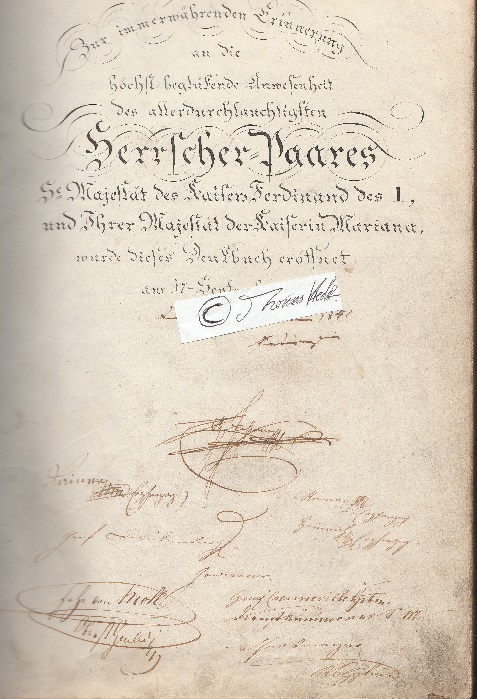 Der Band eröffnet 1841 mit der Signatur des KAISERS FERDINAND I. (1793-1875, 1835 bis 1848 Kaiser von Österreich und König von Böhmen und als Ferdinand V. seit 1830 auch König von Ungarn und Kroatien, genannt DER GÜTIGE) mit Ort und Datum "Am 18. September 1841" und mit den Signaturen der vier ERZHERZÖGE : ERZHERZOG JOHANN VON ÖSTERREICH (1782-1859, Mitglied des Hauses Habsburg, Bruder von Kaiser Franz I., österreichischer Feldmarschall und in der Revolutionszeit von 1848/1849 deutscher Reichsverweser. Im Herzogtum Steiermark war er durch ein halbes Jahrhundert Förderer und Modernisierer von Industrie, Landwirtschaft und Eisenbahnwesen sowie im Kultur- und Bildungsbereich); ERZHERZOG RAINER VON ÖSTERREICH (1827-1913, populäres Mitglied des Kaiserhauses, Förderer von Kunst und Wissenschaft und Oberkommandierender der k.k. Landwehr (der cisleithanischen Territorialverteidigung)); ERZHERZOG HEINRICH VON ÖSTERREICH (1828-91, aus dem Haus Habsburg-Lothringen war kaiserlich-österreichischer Feldmarschallleutnant)...