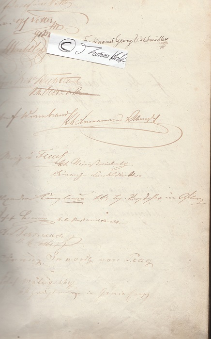 Weiter haben sich eingetragen : HUGO GRAF HUYN (1814-68, k.k. Kämmerer, Dienstkämmerer weiland des Kaisers Ferdinand); Franz de Paula von und zu Liechtenstein (* 25. Februar 1802 in Wien; † 31. März 1887 ebenda, österreichischer General); Abt HONORIUS BURGER (1788-1878, österreichischer Benediktinerpater, Historiker und Zeichner); MARIA CAROLINA VON NEAPEL-SIZILIEN (Herzogin von Berry, französisch Marie Caroline, princesse de Bourbon-Deux Siciles, duchesse de Berry (* 5. November 1798 in Palermo; † 16. April 1870 in Schloss Brunnsee bei Mureck, Steiermark, älteste Tochter des späteren Königs Franz I. beider Sizilien); ERZHERZOG JOSEPH VON ÖSTERREICH (1776-1847, Feldmarschall, Regent von Ungarn und ein Jahr später Palatin von Ungarn) 22.12.1843; JOSEF DANNHAUSER (Joseph Dannhauser,1805-45, österreichischer Maler und Grafiker der Biedermeierzeit) 1843, der bedeutendste dt. Dichter der Romantik JOSEPH FREIHERR VON EICHENDORFF (JOSEPH VON EICHENDORFF, 1788-1857); JOHANN MATTHIAS RANFTL (1804-54, österreichischer Maler und Grafiker) 1850; CARL RITTER VON STÄHLIN (Carl von Stählin, 1808-81, österr. Jurist, 1855 Ritterstand) 22.8.1855; LEOPOLD KUPELWIESER (1796-1862,
