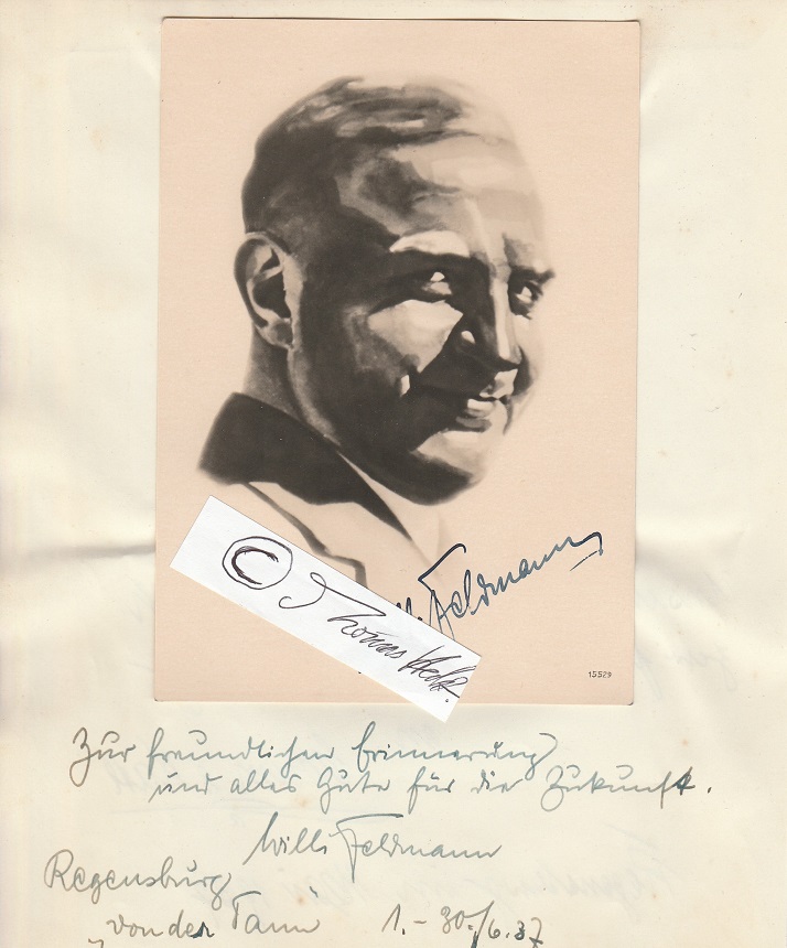 E.Albumblatt 1 S. (8°, mit aufgezogener, Original-Fotoporträtpostkarte mit 6 Szene-Porträts vom Auftritt), mit Empfehlung, Ort, Datum, Unterschrift eigenhändig signiert Regensburg, (Kabarett von der Tann) im Mai 1937