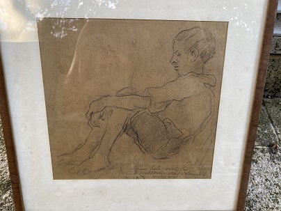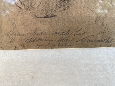 ORIGINAL-KOHLEZEICHNUNG (20 x 20,8 cm, unter Passepartout und Glas gerahmt in einfacher brauner Holzleiste, gesamt 31 x 31 cm), am Unterrand mit Bleistift eigenhändig gewidmet und signiert mit Datum "seinem lieben verehrten Dr. Wohlmann KARL KRUMMACHER 4. Dez. (19)44