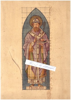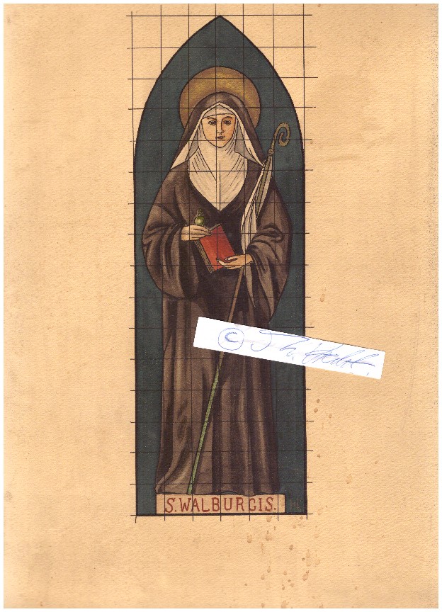 ORIGINAL-AQUARELL (auf Karton gr. 4°, gesamt H 37,5 x B 22 cm, dazu loses Passepartout) einer / eines HEILIGEN - Original-Entwurf für ein KIRCHENFENSTER, rechts unten mit den Initialen H.C. signiert - ca. 1880, teils etwas schmutzfleckig.