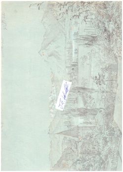 Rückseitig weitere, angedeutete Bleistiftskizze (Landschaft) und violetter Sammlerstempel, möglicherweise aus adligem Besitz.