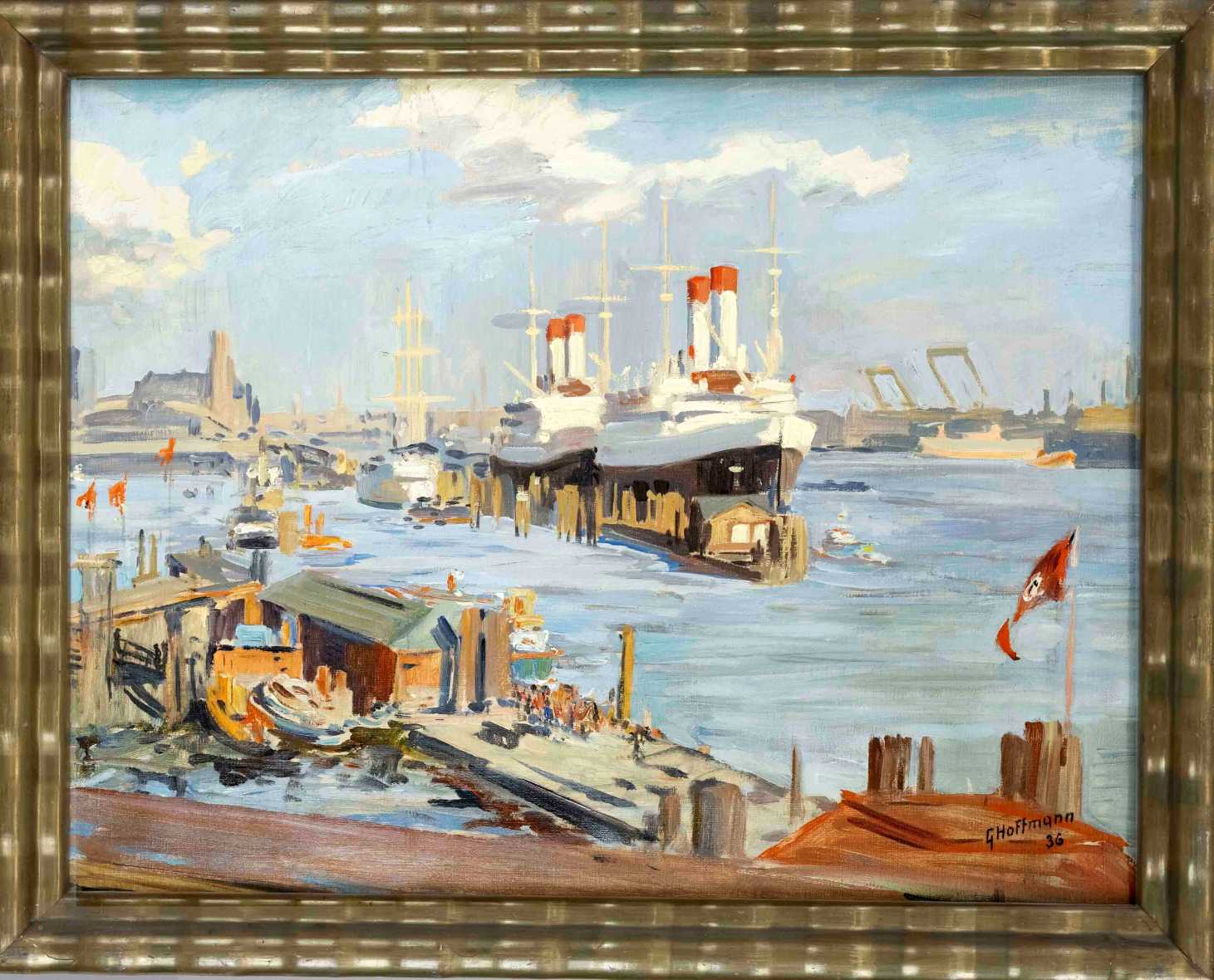 ( Hoffmann, 1st half 20th century, ''Hamburger Hafen - Blick von den Landungsbrücken'', oil on canvas, signed and dated (19)36 lower right, inscribed on the reverse, 50 x 58,5 cm, framed 65 x 74 cm)
