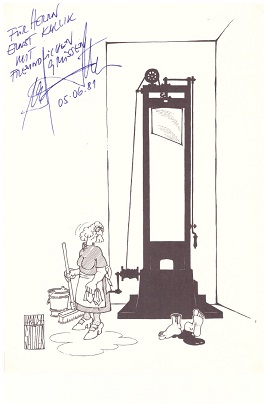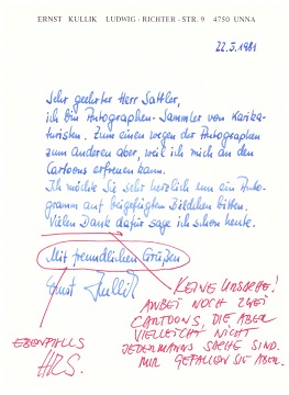 (dito : Briefkarte (mit aufgezogener gedruckter Karikatur) mit Signum und eigenhändiger Unterschrift signiert Euro 18,-; Große Autogrammkarte (8°, rs. Künstler-Adressstempel und Nummer # 1755) mit E.ORIGINAL-ZEICHNUNG, mit Signum signiert Euro 65,-)