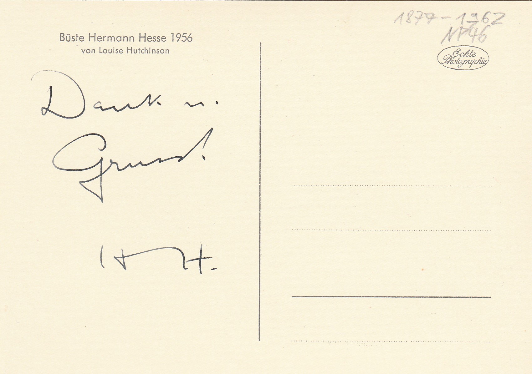 Fotoporträtpostkarte (seine Büste von Louise Hutchinson, 1956), rückseitig mit Enpfehlung mit Initialen eigenhändig signiert