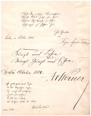 "Kunst und Lehre / bringt Gunst und Ehre. / Berlin Oktober 1894 / A. v. WERNER"