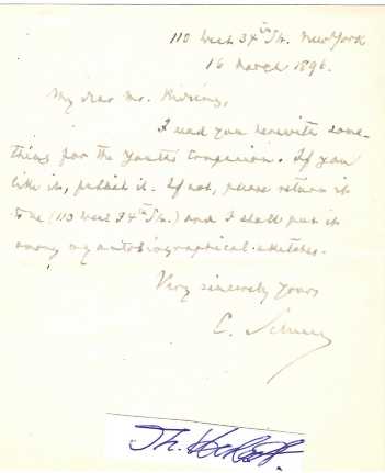 (auch vorhanden / also available, Abbildung II : Eigenhändiger Brief (1 S. 8 to) in Tinte mit Ort, Datum, Unterschrift signiert New York, 16.III.1896 - an den Redakteur einer Jugendzeitschrift, Mr. Riding "...I send you herewith something for the Youth´s Companion. If you like it, publish it. If not, please return it to me (110 West 34 th Str.) and I shall put iit among my autobiographical sketches. Very sincerely yours C. SCHURZ" Euro 650,-)