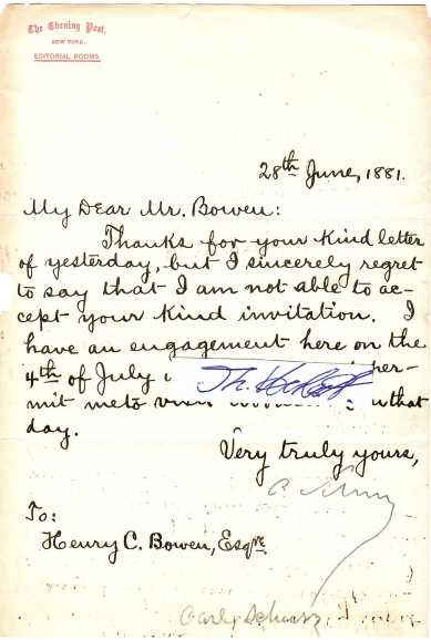 Brief (1 S. 8 to, mit rot gedrucktem Kopf THE EVENING POST, New York, Editorial Rooms, gefaltet, kl. Radausriß) mit Ort, Datum, eigenhändiger Unterschrift signiert New York, 28.VI.1881 - an HENRY C. BOWER, Esqre. mit Bedauern, eine Einladung zum 4. Juli nach Woodstock ablehnen zu müssen, da er bereits einen Termin in New York habe. (Schurz war zu jener Zeit Herausgeber der EVENING POST. - siehe Abbildung I)