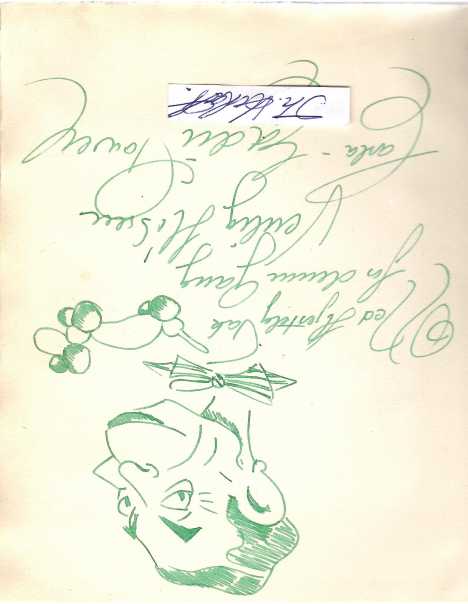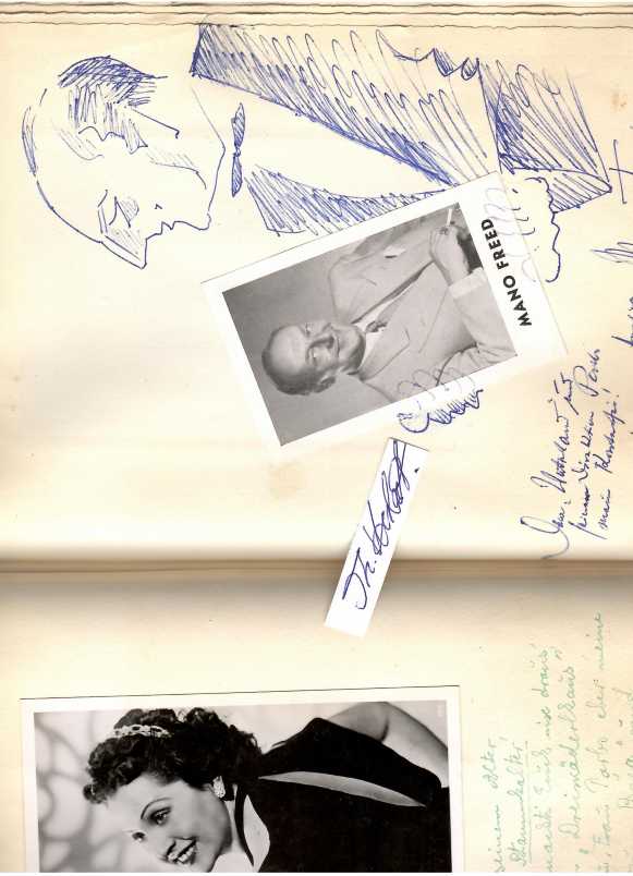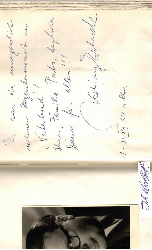 ORIGINAL-GÄSTEBUCH "UNSERE KÜNSTLER 1954" (dunkelgrünes Oln. ca. 4 to, Büttenpapier, leichte Gebrauchsspuren ) komplett Januar - Dezember, mit hunderten von Einträgen, persönliche Zeilen für die Inhaberfamilie Parbs, Gedichte, Zeichnungen und meist mit signierten, schönen Original-Fotografien der Zeit von Artisten, Sänger/innen, Tänzer/innen etc., so z.B. am 31.XII.54 der damals noch recht unbekannte Komiker HEINZ ERHARDT (1909-79), ALBERT STURM (1940-70, deutscher Zauberkünstler, der vornmehmlich eine Papierzerreiß-Darbietung zeigte) mit Original-Zeitungspapiercollage, PAUL CAPRANO (schweizer Zeichner, Artist), GÜNTER KEIL, CLAIRE SCHLICHTING (1905-78, deutsche Schauspielerin und Komikerin), Musikclown NUK (eigentlich Georg Spillner, 1908-98), The Bizzarro Brothers, Will Meyen, The Niberco Brothers, Mano Freed mit Original-Zeichnung, CYCASSO (= Chery K. Gessinger), Zeichner / Karikaturist, (möglicherweise identisch mit CUCASSO = Emilio Coukidis, 1931-2011, Künstler des Montmartre), MARIO TUALA Schlager- und Chansonsänger, EDDIE PAULY mit kl. E.Notenzeile, GRETE CARLMANN (1924-90), ANNY BRUN Chanson-Sängerin, RENE NORMAN, BOB BARTON, YVONNE CARRE, HARALD NIELSEN, MAXIM HERMAN RAFT, WALT VÖLKER (dt. Zauberkünstler), 2 BENDORFFs mit toller ORIGINAL-ZEICHNUNG... u.v,m. - nicht eingehend durchgesehen. - UNIKAT !