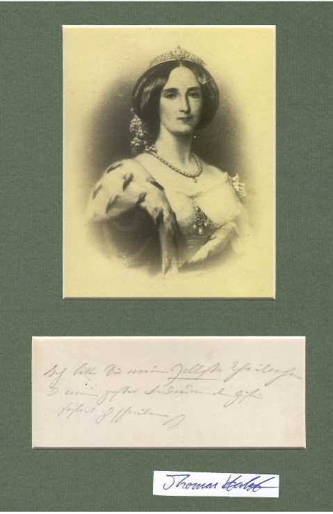 Eigenhändiges Billett (o.U., 3 Zeilen) Ich bitte Sie um schnellste Erledigung... (Anweisung an ihre Hofdame Gräfin Ida Hohenthal) mit Porträt (Repro mit Krone) unter Passepartout gerahmt, 1 S. 4°