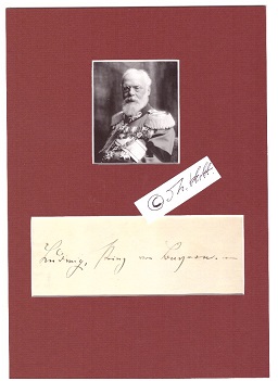 (dito zum gleichen Preis : Albumblatt mit besonders schöner, früher grosser Tintensignatur LUDWIG, PRINZ VON BAYERN mit kleinem Fotoporträtdruck (in Uniform mit Orden) unter rostbraunem Passepartout (1 S. 4°) gerahmt)
