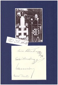 (dito : Albumblatt, in Tinte eigenhändig signiert; zusätzlich von seinem Vater ARTUR SCHUSCHNIGG (1865-1938) als Generalmajor, KURTI SCHUSCHNIGG (Jr., 1926-2018) und BELLA PERUTER eigenhändig signiert; mit Fotoportraitdruck (auf Podium mit dem Kruckenkreuz, Symbol österreichischer antinationalistischer Patrioten, zwei Monate vor dem Anschluss bei einer Rede in Wien) unter dunkelblaues Passepartout (1 S. 4°) gerahmt Euro 200,-)