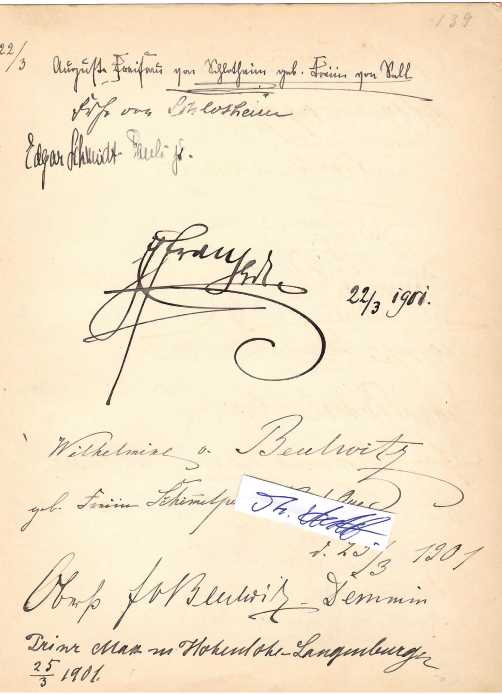 Darüber und rückseitig weitere ca. 23 Einträge meist adliger Zeitgenossen, dabei : EDGAR VON SCHMIDT-PAULI (1881-1955, deutscher Schriftsteller, Journalist und Literaturfunktionär), Prinz Max zu Hohenlohe-Langenburg (1861–1935, Vater des hingerichteten Widerstandskämpfers gleichen Namens), Fürst PHILIPP ZU EULENBURG-HERTEFELD (1847-1921, preußischer Diplomat und enger Vertrauter des Deutschen Kaisers Wilhelm II.) mit Datum 25.III.1901 ...u.v.m.