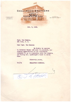 - an Captain R.J. VAN DEUSEN, Secretario Particular del Gobernador San Juan, PORTO RICO, ebenso Luftfahrtpionier Pan American Airways des Airmail Service between Porto Rico and the United States "...we desire to express to Governor Towner and also to yourself, our sincere appreciation of the courtesies extended to us in connection with the Lincoln car during Col. Lindbergh´s visit to Porto Rico..."