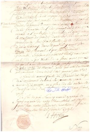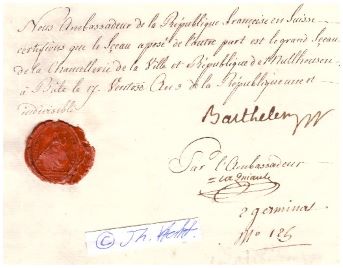 Bestätigung (1/2 S. gr. folio, Wasserzeichen, mit rotem, intaktem Wachssiegel, gefaltet) mit Ort, Datum, eigenhändiger Unterschrift signiert Bale, le 17. Ventose an 3 (7.III.1795)