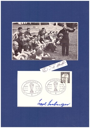 (dito wie vor : Sonderpostkarte zum FIFA World Cup 1974, von Seppl Herberger eigenhändig signiert, mit Fotodruck (als Reichstrainer vor der WM-Mannschaft stehend, s. Abb. 2), unter dunkelblaues Passepartout (4°) gerahmt)