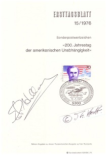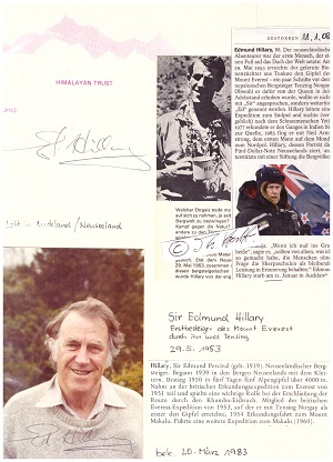 (dito : Großfoto (Farbrepro,4°) , eigenhändig signiert Euro 95,-; kleines Farbportraitfoto eigenhändig signiert Euro 75,-; eigenhändige Unterschrift auf Himalayan Trust stationary Euro 65,-; Eigenhändige Unterschrift auf Ersttagsblatt mit Sonderpostwertzeichen 200. Jahrestag der amerikanischen Unabhängigkeit 15/76 Euro 48,-)