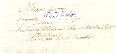 E.Albumblatt (1 S. 8° schmal quer, 9,5 x 20 cm) in Tinte mit langem, lateinischem E.ZITAT, Ort, Datum, voller Unterschrift JOH. CHRISTOPH MYLIUS signiert
