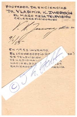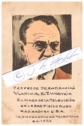 VLADIMIR ZWORYKIN (Wladimir Kosmitsch Sworykin; 1888-1982) russisch-amerikanischer Ingenieur, Physiker und Erfinder, einer der Väter des modernen elektronischen Fernsehens, war auch an der Entwicklung des Farbfernsehens und des Elektronenmikroskops (1942) beteiligt.